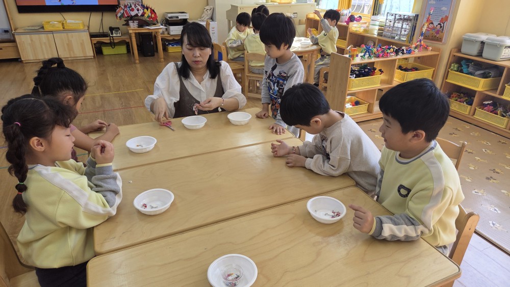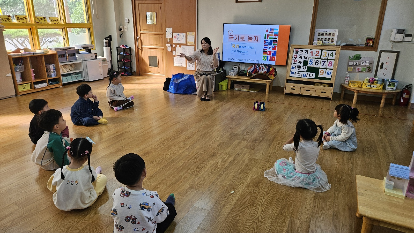 10월 23일~24일 이틀간 다문화교육 정책학교 운영의 일환으로 합천군 가족센터와 연계하여 찾아가는 결혼이민자 다이음교육을 실시하였습니다. 2학기에는 1학기 때 오셨던 일본 출신 결혼이민자 강사님을 한번 더 모시고 세계 여러 나라의 국기와 문화에 대해 알아보는 시간을 가졌습니다. 이후에는 세계 여러 나라 국기에 대하여 5세 친구들은 '나만의 국기 만들기', 6세 친구들은 '국기 팔찌 만들기', 7세 친구들은 '국기 만화경 만들기' 활동을 진행하였습니다. 이번 활동을 통해 아이들은 세계 여러 나라에 대한 관심을 넓히고, 다른 문화를 존중하며 함께 어울리는 태도를 배우는 소중한 시간이 되었습니다.