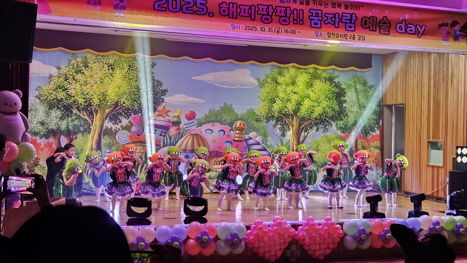 2025. 해피팡팡!! 꿈자람 예술 Day?? 합천유치원 아이들의 멋진 도전이 담긴 꿈자람Day는 난타, 수화, 깃발춤, 악기연주 등 무대로 구성되어 아이들 각자의 개성과 끼를 마음껏 펼칠 수 있었습니다. 친구들과 함께 협력하며 하나씩 이루어가는 과정 속에서 도전하는 용기와 무대를 즐기는 자신감이 자연스럽게 빛났습니다. 무대 위에서 반짝이는 아이들의 눈빛과 학부모님들의 따뜻한 응원이 더해져 아이들에게는 잊지 못할 소중한 경험이 되었으리라 생각합니다. 앞으로도 우리 아이들이 오늘의 경험을 바탕으로 더 큰 꿈을 향해 성장해갈 수 있도록 많은 응원 부탁드립니다.